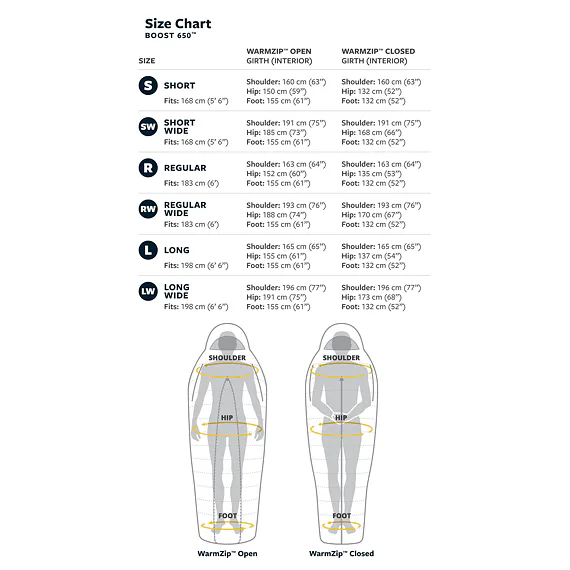 Každá velikost - Small, Regular, Long - je k dispozici také v širším provedení díky rozepnutí zipu, takže získáte spací pytel přesně jaký chcete a přesně ve velikosti, kterou potřebujete.