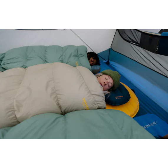 Přesně tvarovaný prostor na nohy lze navléknout přes většinu karimatek pro eliminaci průvanu, nebo jej přetáhnout přímo přes chodidla pro extra teplo.